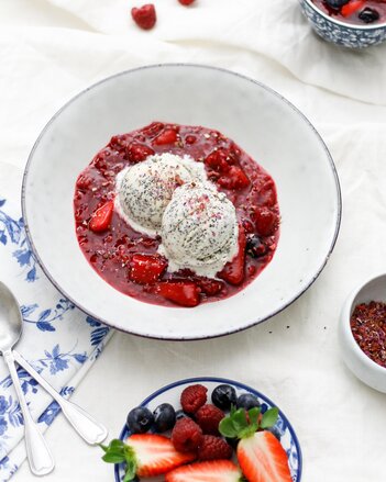 Eiskugeln abstechen und mit dem Sommerbeeren-Kompott servieren.