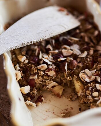 Der knusprige Müsliauflauf lässt sich perfekt am Abend schon vorbereiten. Bevor man morgens unter die Dusche hüpft, schiebt man ihn ins Backrohr und 30 Minuten später taucht man ein ins knusprige Frühstücksglück.