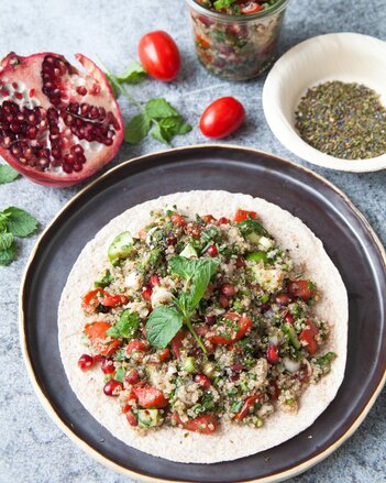 Granatapfel halbieren und Kerne herausnehmen. Quinoa in eine Salatschüssel geben und mit den Kräutern, Cherrytomaten, Gurkenwürfeln und Frühlingszwiebeln vermengen. Dressing darüber gießen und alles gut vermengen und etwas ziehen lassen. Salat mit dem restlichen Nanas Taboulé bestreuen oder auf Tellern oder in kleinen Gläsern anrichten und servieren. Bei Bedarf erneut mit Salz und Pfeffer schwarz würzen.