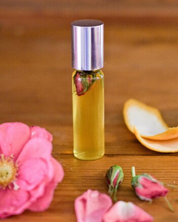 Jojobaöl, ätherische Öle und optional getrocknete blüten als Deko in ein Fläschchen füllen, leicht schwenken und verschließen.