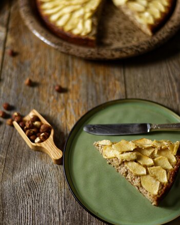 Den Teig in eine ausgebutterte Backform füllen und mit den Apfelscheiben belegen. Bei 170° ca. 45 Minuten backen.