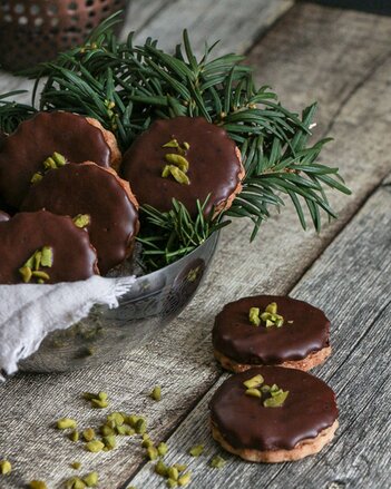 Die Schokolade über dem Wasserbad schmelzen und die Hälfte der Plätzchen mit Schokolade überziehen und den Pistazien bestreuen.