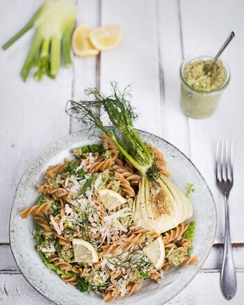 Die noch heißen Nudeln mit dem Pesto vermengen und mit dem Fenchel servieren.