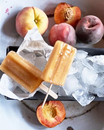 Pfirsich in feine Spalten schneiden und in die Eisformen legen - 2 bis 3 Scheiben pro Eislutscher (je nach Größe eurer Formen)