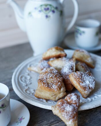 Auf dem Foto sieht man mehrere Polsterzipf auf einem weißen Teller. Im Hintergrund ist Teegeschirr zu sehen. | © SONNENTOR