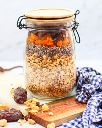 Nacheinander Haselnüsse, Kakaonibs, Aprikosen und Datteln in ein verschließbares Glas schichten. Zum Verschenken noch mit einer Schleife versehen.