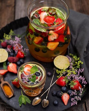 Kurkuma-Zitronen Sirup, Limettenscheiben, Beeren und Minze in ein Gefäß geben. Mit 300 ml Soda aufgießen und für rund 2 – 5 Stunden gekühlt ziehen lassen.