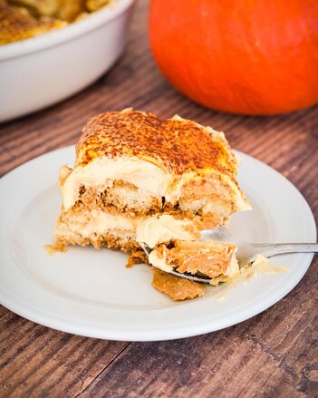 Tipp: Für noch mehr Pumpkin Spice Geschmack zusätzlich noch Sirup vor dem Servieren über das Tiramisu träufeln.