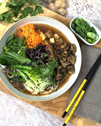 Jetzt geht’s ans Anrichten: Serviere die heiße Suppe in großen Schüsseln und toppe sie mit den Ramen Nudeln, dem frischen Gemüse, dem krossen Tofu, den süß-sauren Pilzen, den Kräutern und dem schwarzen Sesam. Und fertig ist die pikante Suppe, die so richtig herzhaft schmeckt und noch dazu nur so vor Gemüse strotzt.