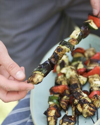 Gemüse putzen und in mundgerechte Stücke zerteilen. Abwechselnd auf die Spieße auffädeln.
