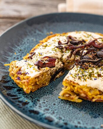 Die Sauce auf den Rösti geben und mit dem restlichen Sieglindes Erdäpfelgewürz bestreuen. Die Röstzwiebel darüber streuen und servieren.