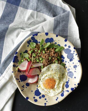 Das Urkorn-Risibisi mit frischen Radieschen und Spiegelei anrichten und mit Schutzengelgewürz bestreuen.