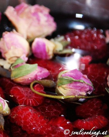 Je nach Menge der Rosenblüten und Himbeeren variiert der Blütenduft oder der süß-säuerliche Geschmack der Himbeeren.