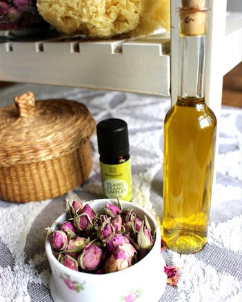 1 Tasse Rosenhydrolat mit 1 Tasse (Hafer-)Milch, 3 Tropfen Rosenöl, 3 Tropfen Ylang Ylang Öl und 2 Tropfen Zedernholz Öl mischen und in das warme Wasser leeren.