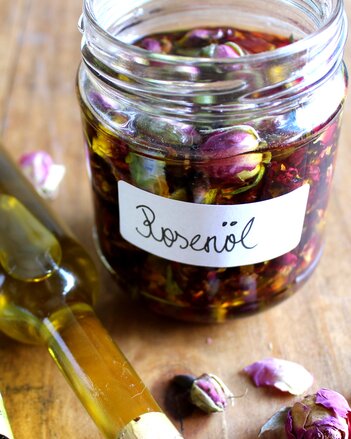 Rosenblüten und Rosenknospen werden zu zwei Drittel in ein sauberes Marmeladenglas gefüllt. Anschließend wird das Glas mit Jojobaöl aufgefüllt und verschlossen. Danach lässt man das Ganze ca. 4 Wochen bei Zimmertemperatur ziehen und schüttelt es gelegentlich.