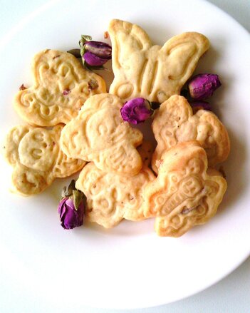 Teig auf einer bemehlten Arbeitsfläche etwa 5 mm dick ausrollen und mit Ausstechern Kekse ausstechen.