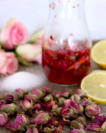 Das Wasser und den Zucker zum Kochen bringen und so lange köcheln bis sich der Zucker auflöst. Zitrone in Scheiben schneiden und die Rosenknospen im Mörser etwas zerstoßen.