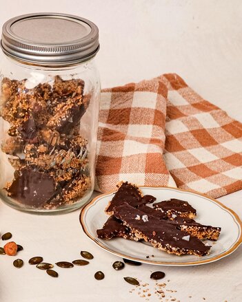 Die Saatenschokolade nun im Kühlschrank fest werden lassen. Danach in kleine Stücke brechen, in ein Glas füllen und am besten gekühlt aufbewahren und innerhalb weniger Tage genießen.