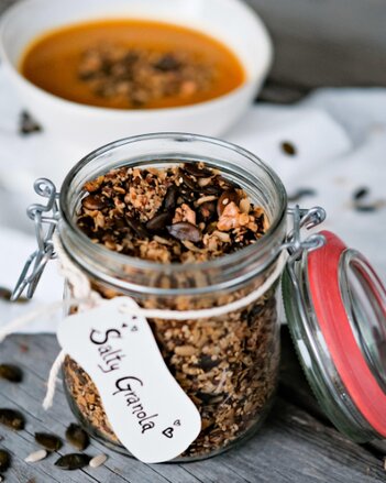 Das salzige Granola ist das perfekte Topping für Suppen, Salate und Bowls!