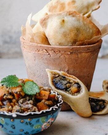 Während der Teig ruht, kann die Füllung vorbereitet werden. Dafür die Süßkartoffel schälen und in ganz feine Stückchen schneiden. Den Blumenkohl und die Zwiebel ebenfalls fein hacken. In einer Pfanne das Olivenöl leicht erhitzen, die Linsen und Zwiebeln darin glasig werden lassen. Das Gemüse hinzufügen, mit der Gemüsesuppe aufgießen und köcheln lassen, bis das Gemüse und die Linsen gar sind. Das Gewürz dazugeben und abschmecken. Die Mischung zur Seite stellen und auskühlen lassen.
