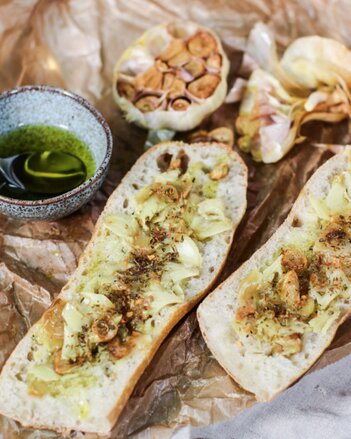 Gebackene Knoblauchknollen herauslösen und die cremigen Zehen auf die beiden geschnittenen Flächen des Baguettes streichen.