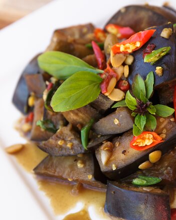 Auberginen in Streifen teilweise schälen, in Scheiben oder große Würfel schneiden, mit Olivenöl im Ofen schmoren oder braten.