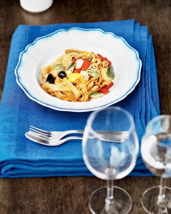 Die Nudeln in kochendes Salzwasser legen, umrühren und 2 Min. kochen lassen, dann abseihen und zum Gemüse geben, durchmischen und servieren.