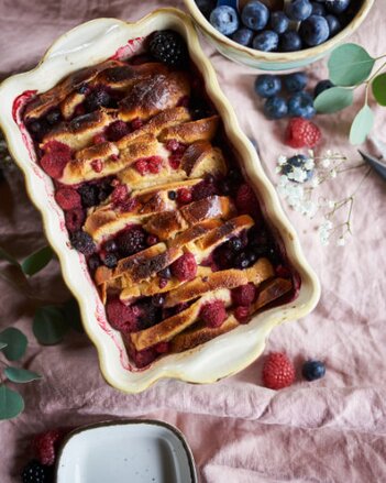 Die Auflaufform mit Öl bestreichen und die Scheiben stehend in die Form schichten. Die Zwischenräume mit Beeren ausfüllen.