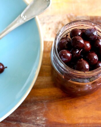 Die Schlehen lässt man nun mindestens ein Monat in der Lake ziehen. Danach füllt man die Schlehen „Oliven“ mitsamt der Flüssigkeit in kleinere Gläser um.