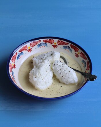 Auf dem Foto sind drei Schneenockerl auf Vanillesauce zu sehen. | © SONNENTOR