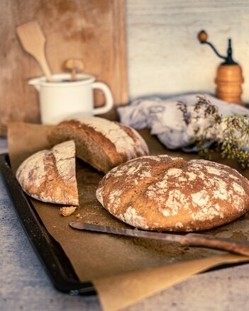 Beide Brotlaibe auf das heiße Backblech geben und mit Mehl bestäuben. Anschließend erneut 10-15 Minuten rasten lassen. Brote an der Oberfläche einschneiden und in den vorgeheizten Ofen geben. Die ersten 10 Minuten bei 240 °C backen. Die Temperatur anschließend auf 200 °C reduzieren und die Brote weitere 40-45 Minuten fertig backen.