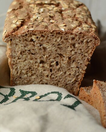 Die Teigoberfläche mit etwas Wasser bepinseln und Haferflocken darüberstreuen. Ca. 45 min backen und anschließend die Klopfprobe machen. Klingt der Boden des Brotes beim Klopfen noch nicht hohl, das Brot noch ein paar Minuten ohne Form weiterbacken.