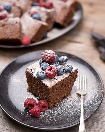 Die Masse in eine eckige Grilltasse füllen und 30 Minuten im vorgeheizten Grill bei 165 - 170 Grad backen. Den Schokokuchen vom Grill mit Staubzucker und etwas Chai Küsschen bestreut servieren.