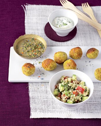 Taboulé, Falafel und Joghurt-Minze-Raita mit Gewürz-Blüten dekoriert servieren.