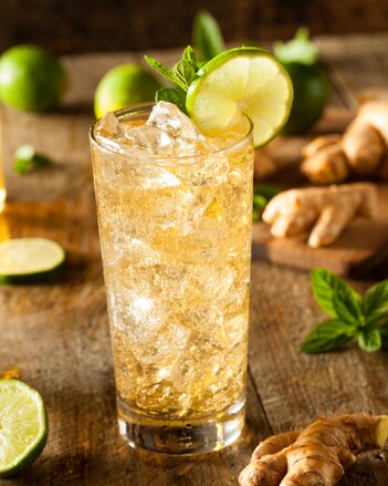 2 EL Limettensaft hinzufügen und mit gekühltem Mineralwasser auffüllen.