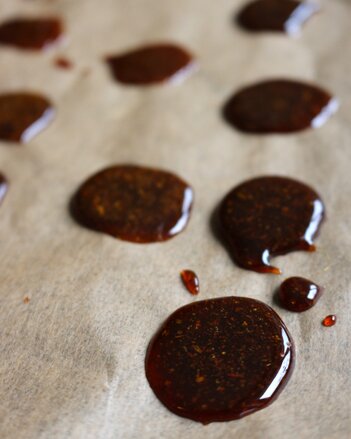 Ist der Zucker flüssig, dreht man die Temperatur zurück und rührt Kräuter, Ingwer, Kurkuma und Zitronensaft unter. Die Masse kann nun in kleine Kleckse auf Backpapier getropft werden (1 TL ergibt etwa 2-3 Zuckerl).