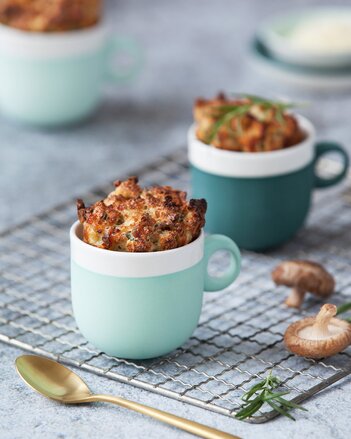 Schnittlauch waschen, trockenschütteln und in feine Röllchen schneiden. Bergkäse reiben. Tassenknödel aus dem Ofen nehmen und mit der Pilz-Sauce, dem frischen Schnittlauch und dem Bergkäse servieren.