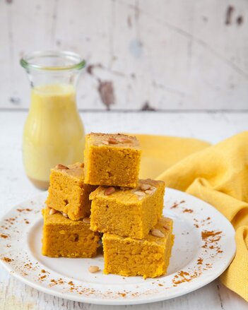 Backofen auf 200°C Ober-/Unterhitze (180°C Umluft) vorheizen. Grieß, Mehl, Kurkuma Latte Vanille und Backpulver vermengen.