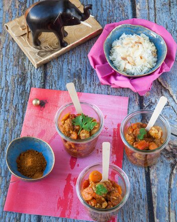 Die Hälfte des Korianders untermischen. Die Hälfte der Mandelblättchen über den Reis geben und diesen mit dem Masala Huhn auf Tellern anrichten. Das Ganze mit dem restlichen Koriander und den Mandelblättchen bestreuen und servieren.