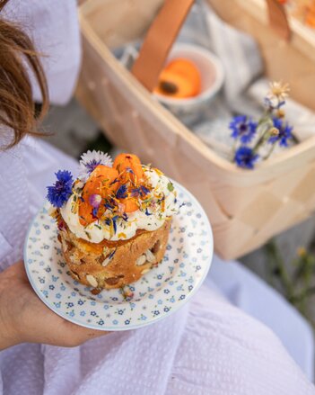 Die Biskuitroulade in 8-10 Stücke schneiden und mit der Schnittfläche nach oben auf einen Kuchenteller setzen. Die Creme in einen Spritzbeutel füllen und auf die Rouladenstücke spritzen. Mit frischen Marillenspalten garnieren und mit der SONNENTOR Blütenmischung Durch die Blume bestreuen.