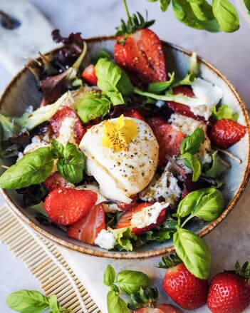 Frische Erdbeeren, Burrata und das ätherische Gewürzöl Salate & Dips sind die ideale Kombination für diesen Salat!
