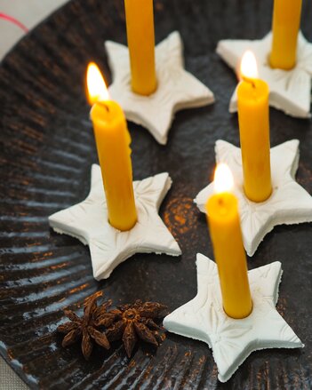 In die Mitte der Sterne jeweils eine Bienenwachskerze drücken, sodass noch ein Tonboden unter der Kerze erhalten bleibt – die Kerzen können auf diese Weise nach dem Trocknen mit flüssigem Kerzenwachs in den Kerzenhaltern fixieren werden.