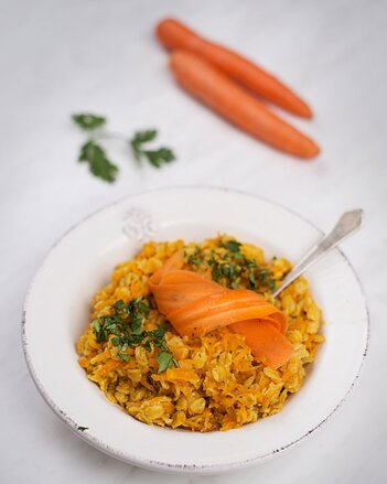 Schnell zubereiteter Haferbrei mit süßen Karotten, Orangensaft und Eintopfgewürz.