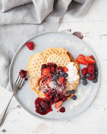 Waffeln mit der heißen Beerensauce, Kokos-Sahne, Him- und Heidelbeeren sowie Erdbeeren und gerösteten Kokosflocken servieren.