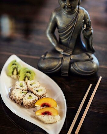Für die Früchte Maki Rolle: eine Sushi Matte mit Klarsichtfolie umhüllen. Milchreis in einem Rechteck drauf verteilen. Längliche Fruchtstücke (am besten bunt mit zum Beispiel Kiwis, Beeren und Nektarinen) in die Mitte legen. Einrollen und eine Sushi Rolle formen. Die Rolle in Kokosraspeln oder geriebenen Haselnüssen wälzen und mit einem scharfen Messer in gleich große Stücke schneiden.