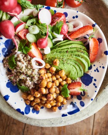 Den gewürzten Buchweizen auf zwei Schüsseln aufteilen und mit Gemüse, Rucola, Kichererbsen, Beeren und Avocado belegen. Mit etwas bestem Olivenöl beträufeln und genießen.