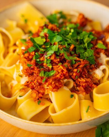 Pasta auf einem Teller anrichten. Joghurtsauce, gebratenen Tofu und Paprikabutter auf den Nudeln anrichten und mit Petersilie garnieren.
