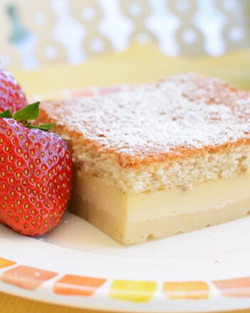 Auf dem Foto ist ein Teller mit Vanille-Schichtkuchen zu sehen. Daneben sind zwei frische Erdbeeren zu sehen. | © SONNENTOR