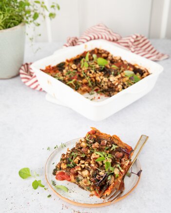Haselnüsse fein hacken und darüber streuen. Lasagne im vorgeheizten Ofen auf der mittleren Schiene ca. 30-45 Minuten backen. Vor dem Servieren kurz abkühlen lassen und mit frischem Thymian garniert servieren.