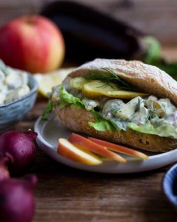 Apfel, Zwiebel und Gurke in die Joghurtsauce geben. Anschließend die Auberginenstreifen dazu geben. Alles mit Salz abschmecken und in den Kühlschrank zum Durchziehen geben. Die Masse in Vollkorn-Brötchen geben und genießen.